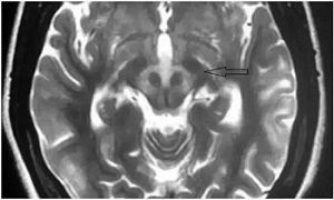教授接着说,“小熊猫脸征”,中脑下部层面的双侧大脑脚、 上丘、 导水管、 导水管周围灰质核团、中央上核等构成了小熊猫脸的大体结构, 而双侧受累而呈长T2 信号的红核周围纤维束与短T2的中央被盖束勾勒出小熊猫的双眼。