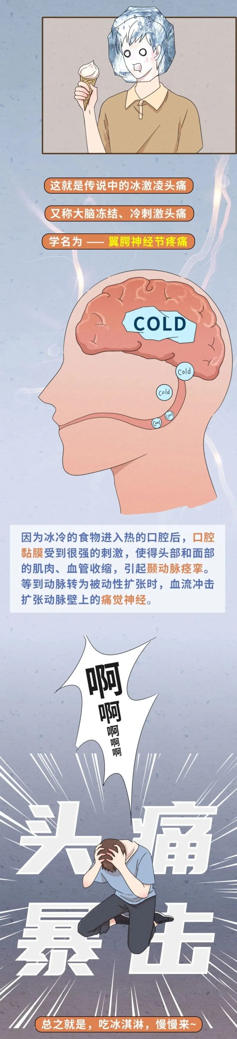 “脑结冰”是一种形象的说法,天热时人体血管扩张,大量、快速地进食过冷食物,上颚会被迅速冷却,上颚后部正好是神经中枢,神经群受到突如其来的寒冷刺激后急剧收缩,直通大脑的动脉痉挛,就像脑子被“冻”住了一样。