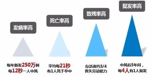 脑卒中又称为脑中风,包括出血性脑血管病和缺血性脑血管病,具有高发病率、高死亡率、高致残率和高复发率的特点,是严重威胁中老年人健康及生命的主要疾病,我国脑血管病近年在全死因顺位中已上升为位。一旦发生脑血管病,又存在高难治愈率的特点,因此 脑卒中关键在于“防”。